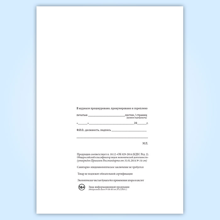 Вы получаете печатную продукцию прошнурованной и c местом для вашей печати в соответствии с действующими нормативными документами:
