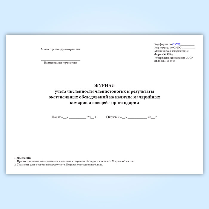 Журнал учета численности членистоногих и результаты экстенсивных обследований на наличие малярийных комаров и клещей - орнитодории (форма № 368-у) в Сургуте купить