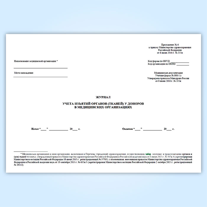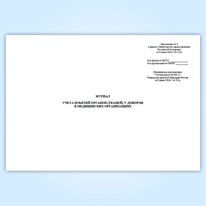 Журнал учета изъятий органов (тканей) у доноров в медицинских организациях (форма № 008-1/у) в Сургуте купить