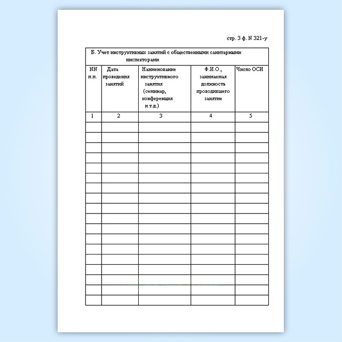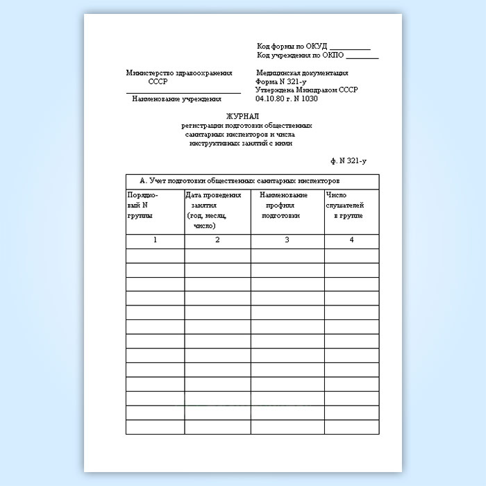 Журнал регистрации подготовки общественных санитарных инспекторов и числа инструктивных занятий с ними (форма № 321-у) в Сургуте купить