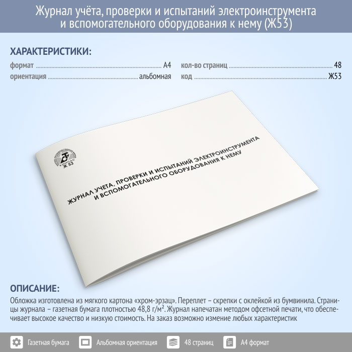 Журнал учета, проверки и испытаний электроинструмента и вспомогательного оборудования к нему (48 стр., Ж53) в Сургуте купить