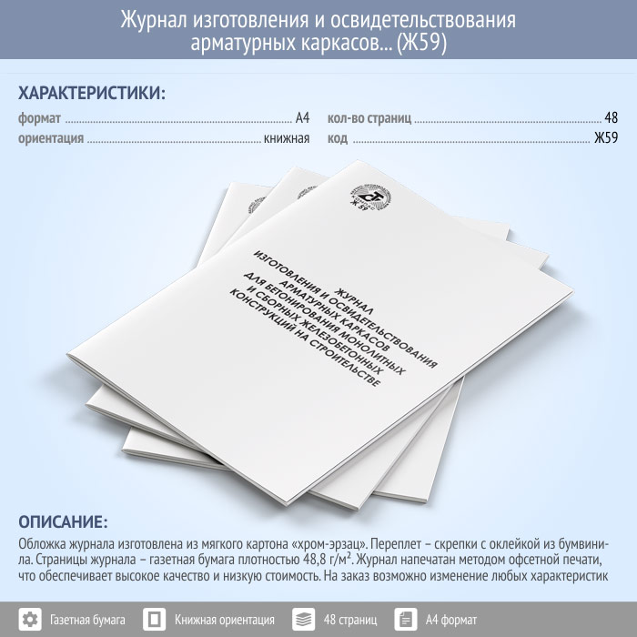 Журнал изготовления и освидетельствования арматурных каркасов для бетонирования монолитных и сборных железобетонных конструкций на строительстве (Ф-48) (48 стр., Ж59) в Сургуте купить