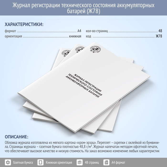 Журнал регистрации технического состояния аккумуляторных батарей (48 стр., Ж78) в Сургуте купить