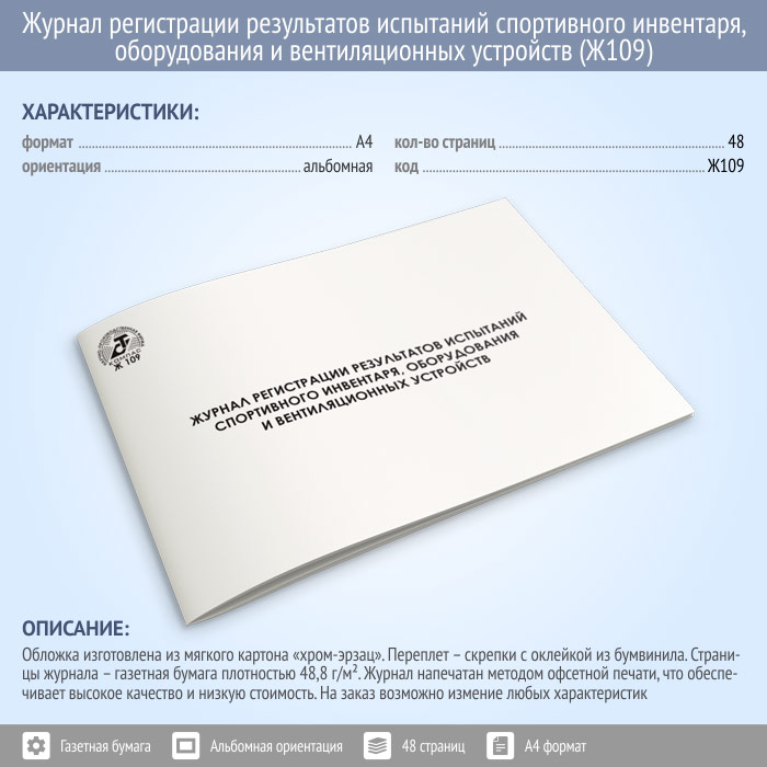 Журнал регистрации результатов испытаний спортивного инвентаря, оборудования и вентиляционных устройств (48 стр., Ж109) в Сургуте купить