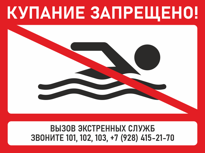 Знак «Купание запрещено!», БВ-01 предупреждает любителей самовольных купаний о том, что место не подходит для купания. Так же знак содержит телефоны эксренных служб