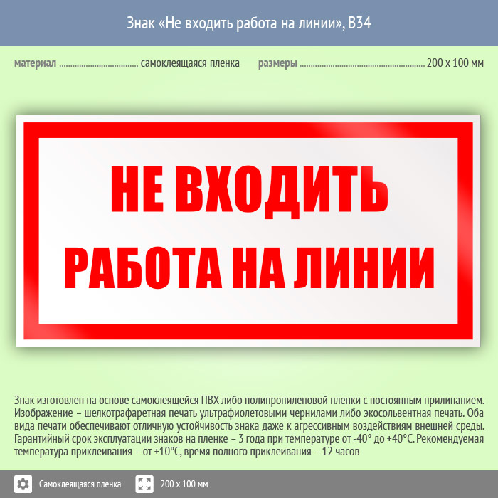 Знак «Не входить работа на линии», B34 (пленка, 200х100 мм)