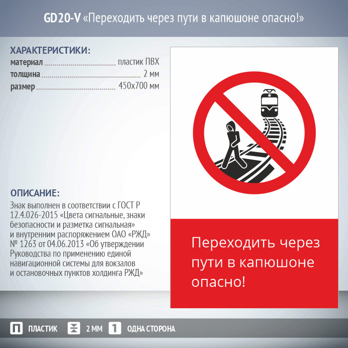 Знак «Переходить через пути в капюшоне опасно!», GD20-V (односторонний вертикальный, 450х700 мм, металл, с отбортовкой и Z-креплением)