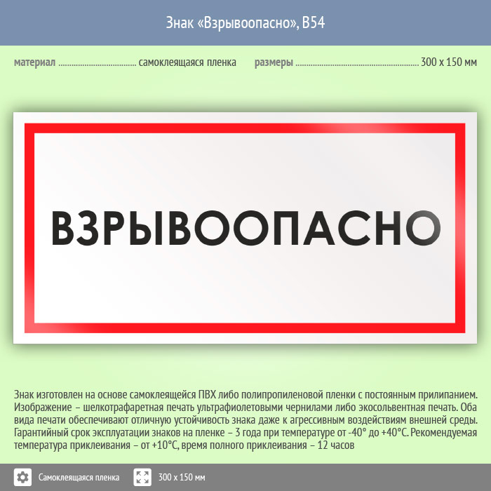 Знак «Взрывоопасно» может быть изготовлен любого размера на самоклеящейся пленке, пластике толщиной 0.5, 2 или 4 мм и металле. Также возможно применение фотолюминесцентных и световозвращающих материалов