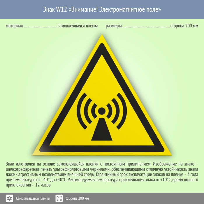 Знак «Внимание! Электромагнитное поле» предупреждает, что поблизости находится электромагнитное поле и надо быть начеку. Код знака: W12