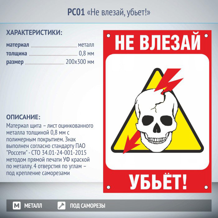 Знак «Не влезай, убьет!», РС01 (металл, 200х300 мм, отверстия под саморезы) в Сургуте купить