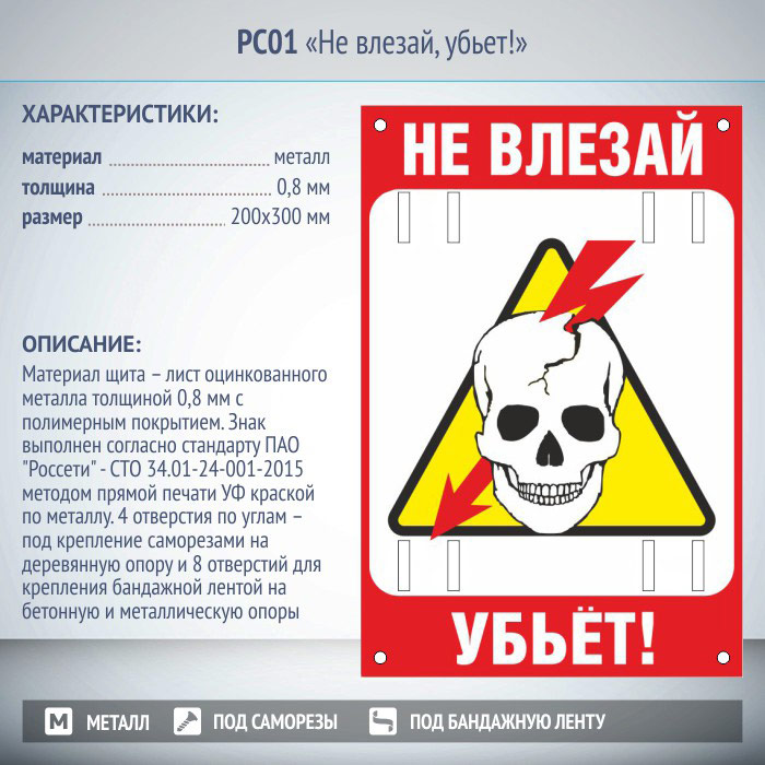 Знак «Не влезай, убьет!», РС01 (металл, 200х300 мм, отверстия под бандажную ленту) в Сургуте купить
