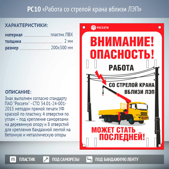 Знак «Работа со стрелой крана вблизи ЛЭП», РС10 (пластик 2 мм, 200х300 мм, отверстия под бандажную ленту) в Сургуте купить