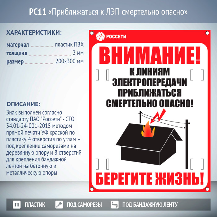 Знак «Приближаться к ЛЭП смертельно опасно», РС11 (пластик 2 мм, 200х300 мм, отверстия под бандажную ленту) в Сургуте купить