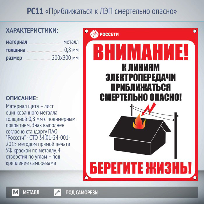 Знак «Приближаться к ЛЭП смертельно опасно», РС11 (металл, 200х300 мм, отверстия под саморезы) в Сургуте купить
