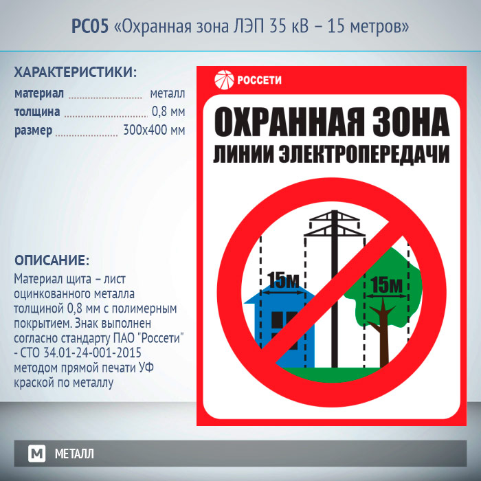 Знак «Охранная зона ЛЭП 35 кВ – 15 метров», РС05 (металл, 300х400 мм) в Сургуте купить