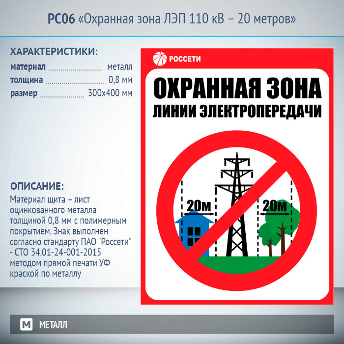 Знак «Охранная зона ЛЭП 110 кВ – 20 метров», РС06 (металл, 300х400 мм) в Сургуте купить