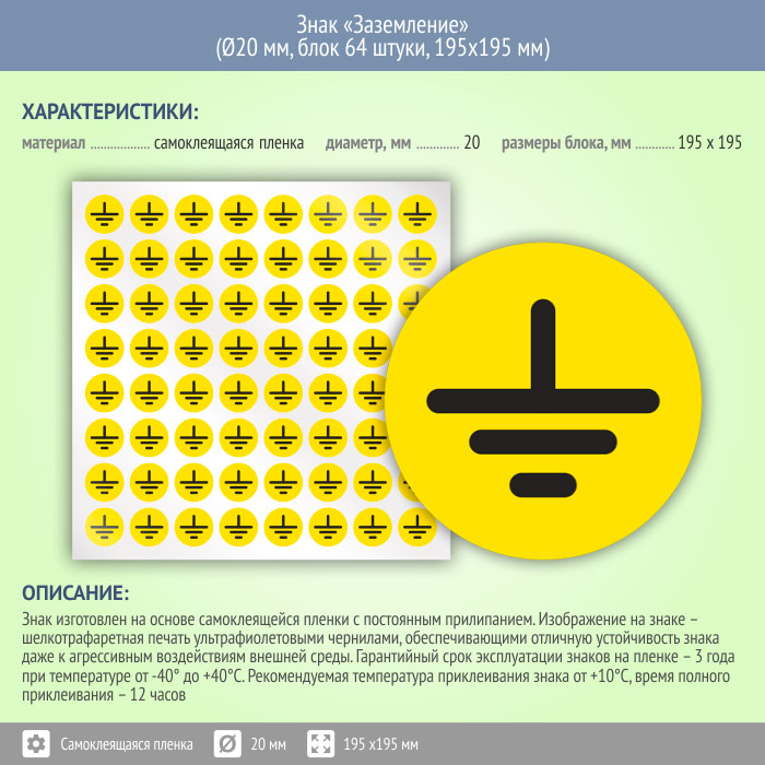 Знак (плакат) «Заземление», S46 (пленка, диаметр 20 мм, блок 64 штуки, 195х195 мм) в Сургуте купить