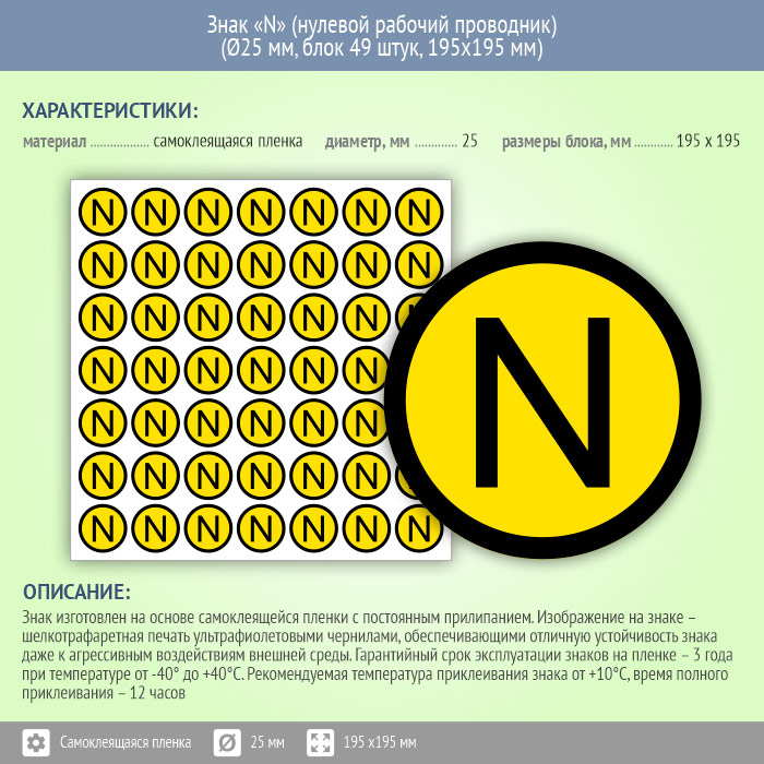 Знак (плакат) «N» (нулевой рабочий проводник), S47 (пленка, диаметр 25 мм, блок 49 штук, 195х195 мм) в Сургуте купить