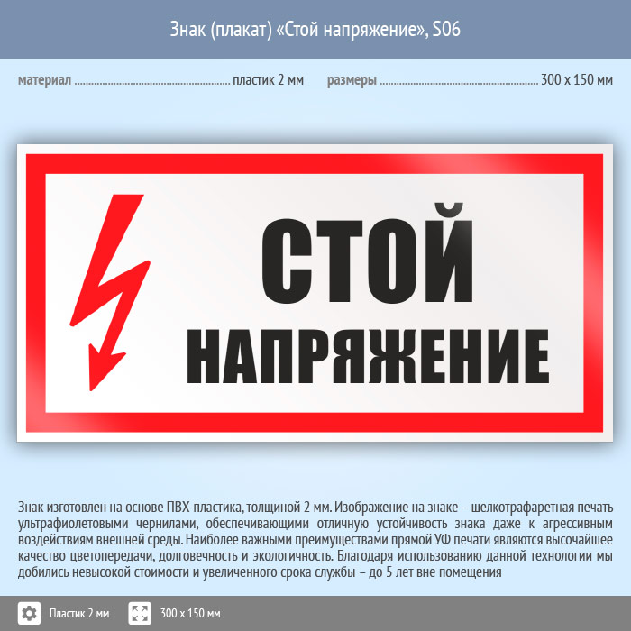 Знак (плакат) «Стой напряжение», S06 (пластик, 300х150 мм) в Сургуте купить