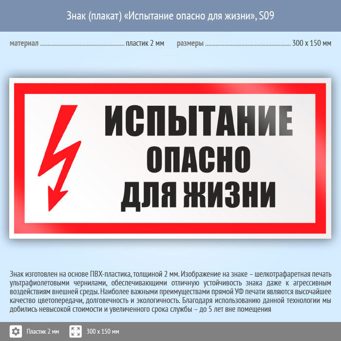 Знак (плакат) «Испытание опасно для жизни», S09 (пластик, 300х150 мм) в Сургуте купить
