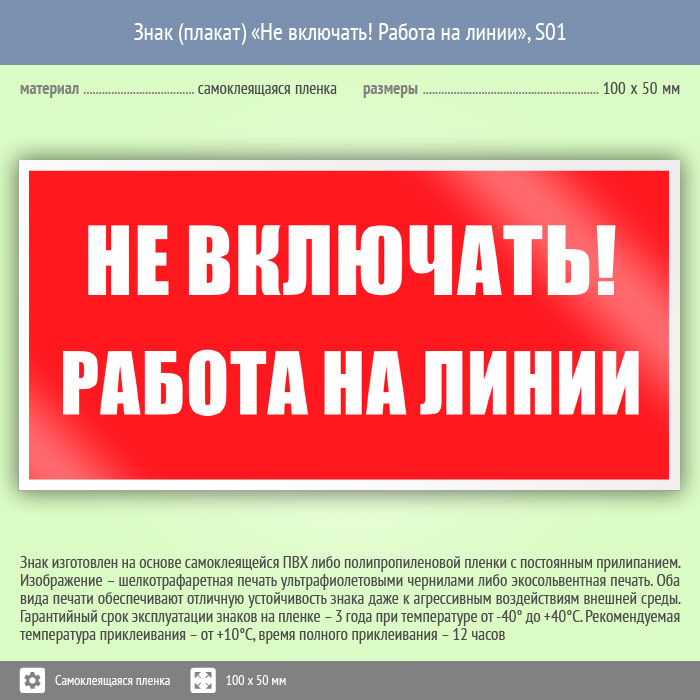 Знак (плакат) «Не включать! Работа на линии», S01 (пленка, 100х50 мм) в Сургуте купить