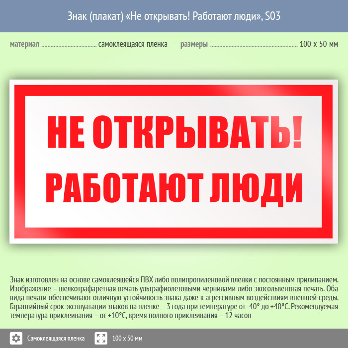 Знак (плакат) «Не открывать! Работают люди», S03 (пленка, 100х50 мм) в Сургуте купить