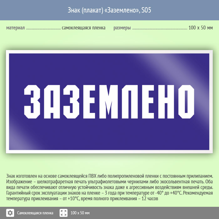 Знак (плакат) «Заземлено», S05 (пленка, 100х50 мм) в Сургуте купить