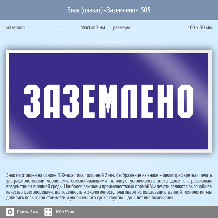 Знак (плакат) «Заземлено», S05 (пластик, 100х50 мм) в Сургуте купить