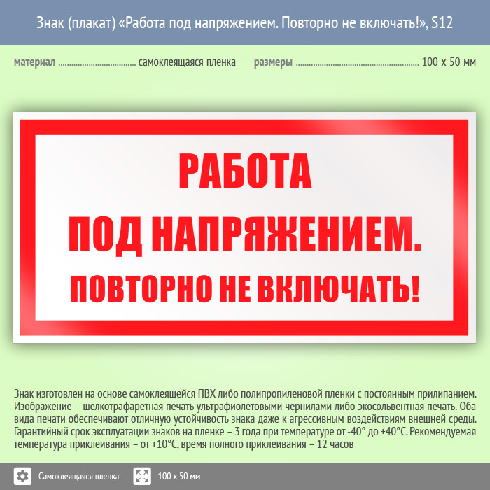 Знак (плакат) «Работа под напряжением. Повторно не включать!», S12 (пленка, 100х50 мм) в Сургуте купить