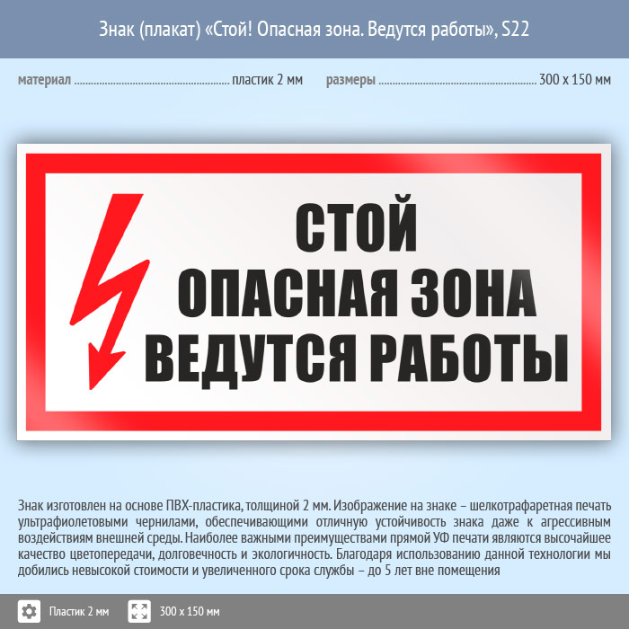 Знак (плакат) «Стой! Опасная зона. Ведутся работы», S22 (пластик, 300х150 мм) в Сургуте купить