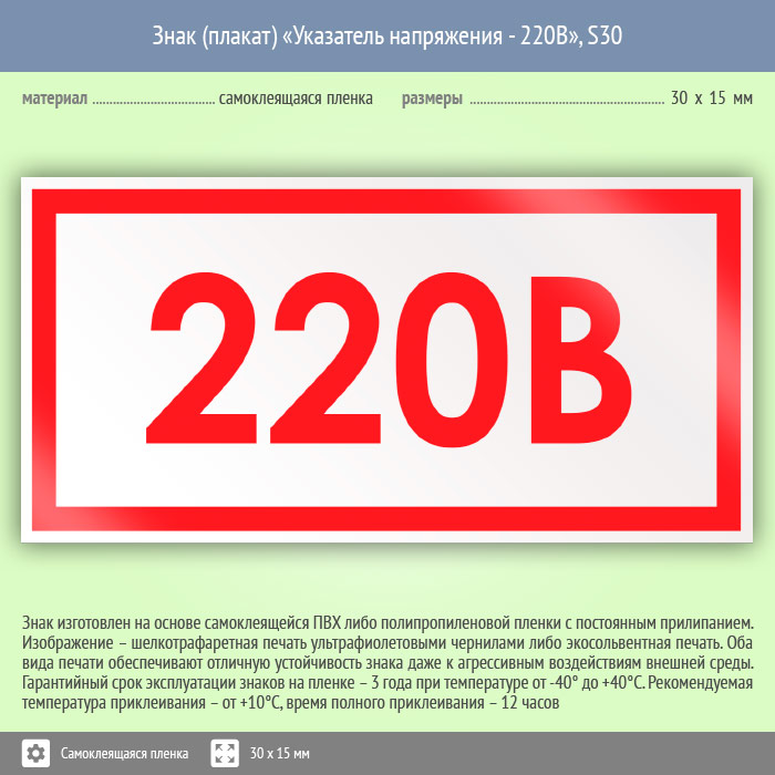 Знак (плакат) «Указатель напряжения - 220В», S30 (50 штук, пленка, 30х15 мм) в Сургуте купить