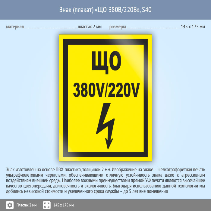 Знак (плакат) «ЩО 380В/220В», S40 (пластик, 145х175 мм) в Сургуте купить