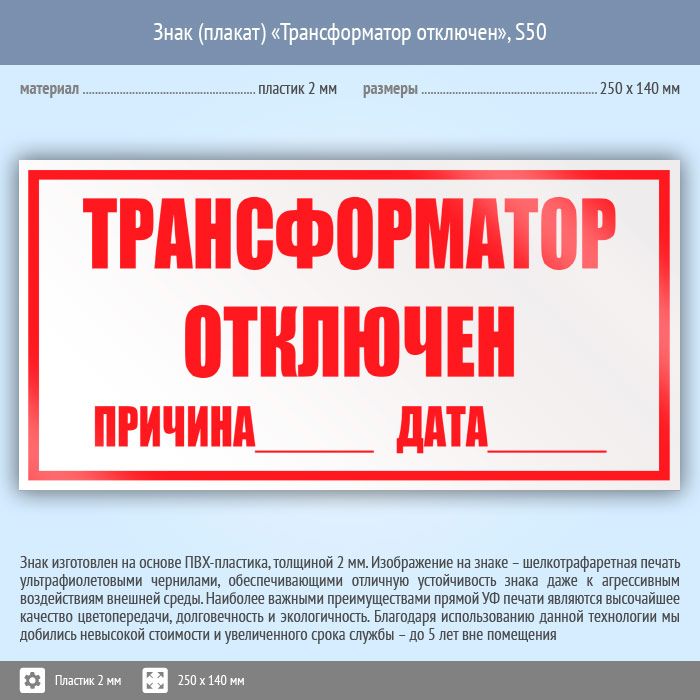 Знак (плакат) «Трансформатор отключен», S50 (пластик, 250х140 мм) в Сургуте купить