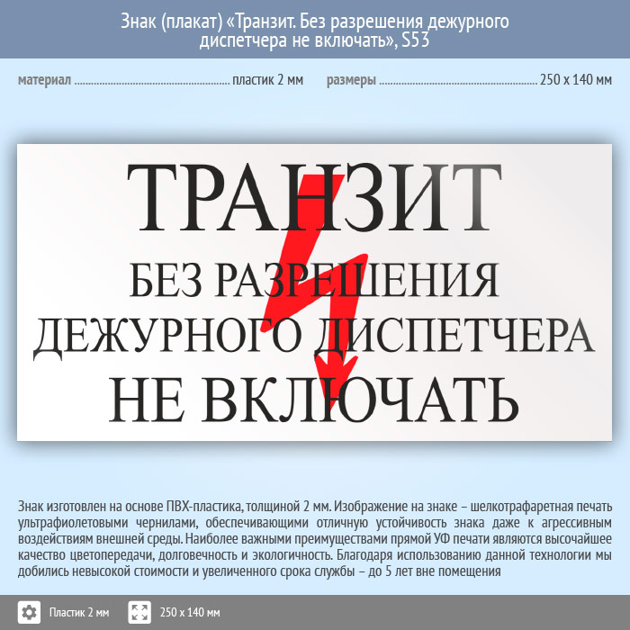 Знак (плакат) «Транзит. Без разрешения дежурного диспетчера Не включать», S53 (пластик, 250х140 мм) в Сургуте купить
