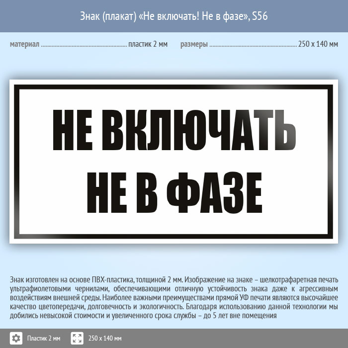 Знак (плакат) «Не включать! Не в фазе», S56 (пластик, 250х140 мм) в Сургуте купить