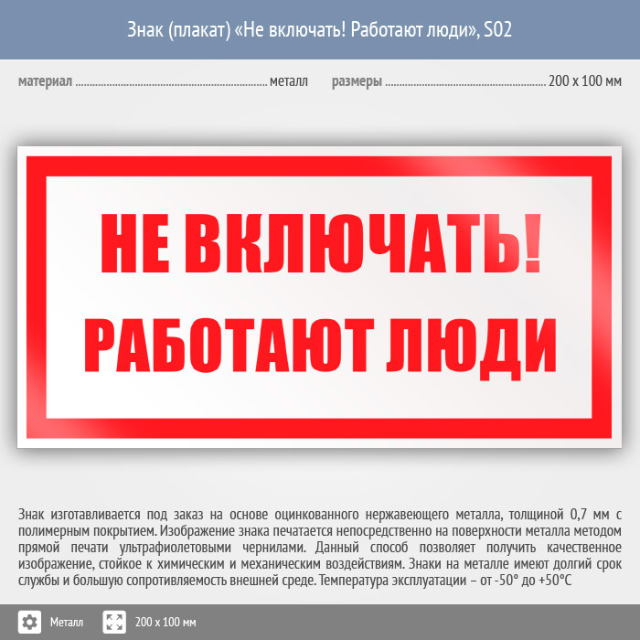 Знак (плакат) «Не включать! Работают люди», S02 (металл, 200х100 мм) в Сургуте купить