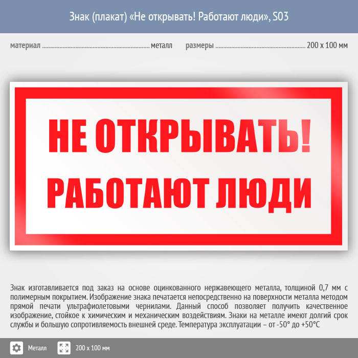 Знак (плакат) «Не открывать! Работают люди», S03 (металл, 200х100 мм) в Сургуте купить