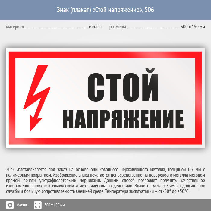 Знак (плакат) «Стой напряжение», S06 (металл, 300х150 мм) в Сургуте купить