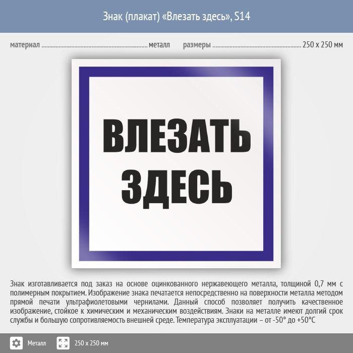 Знак (плакат) «Влезать здесь», S14 (металл, 250х250 мм) в Сургуте купить