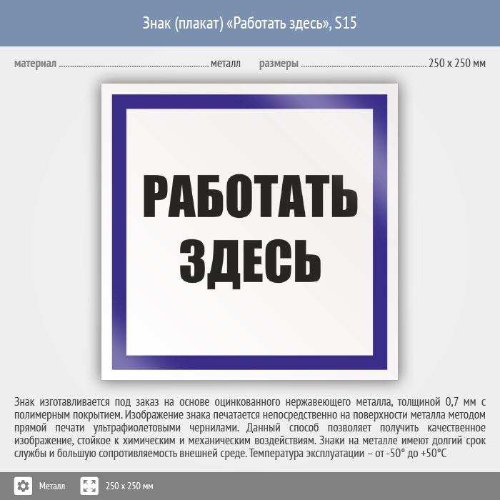Знак (плакат) «Работать здесь», S15 (металл, 250х250 мм) в Сургуте купить