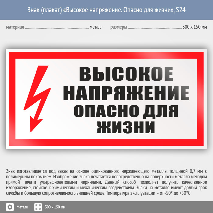 Знак (плакат) «Высокое напряжение. Опасно для жизни», S24 (металл, 300х150 мм) в Сургуте купить