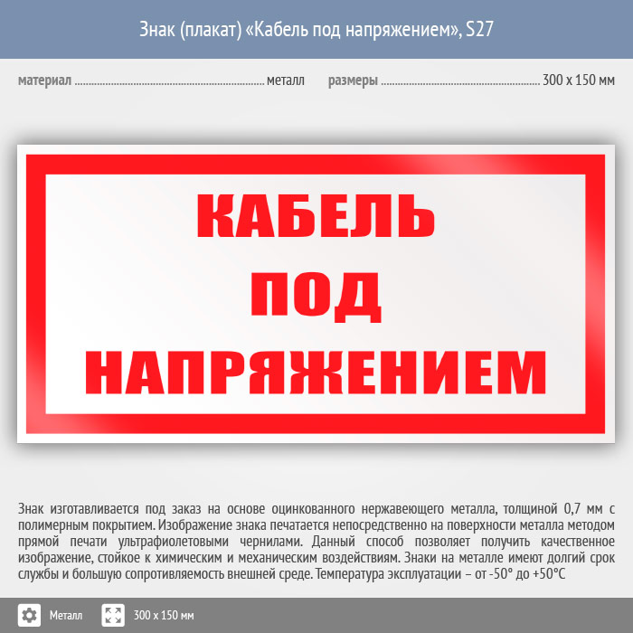 Знак (плакат) «Кабель под напряжением», S27 (металл, 300х150 мм) в Сургуте купить
