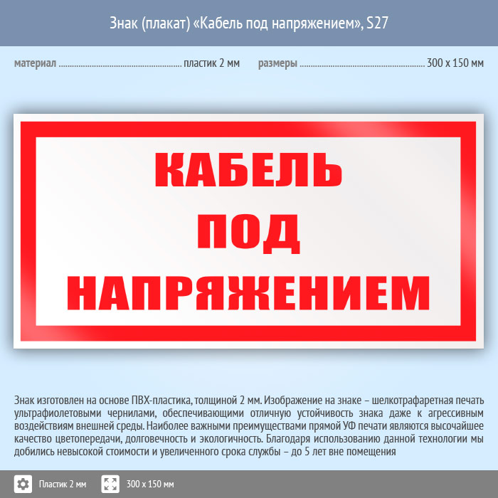 Знак (плакат) «Кабель под напряжением», S27 (пластик, 300х150 мм) в Сургуте купить