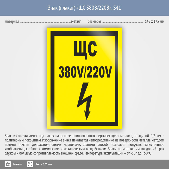 Знак (плакат) «ЩС 380В/220В», S41 (металл, 145х175 мм) в Сургуте купить