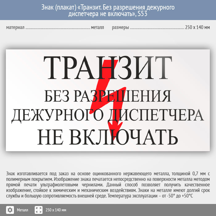 Знак (плакат) «Транзит. Без разрешения дежурного диспетчера Не включать», S53 (металл, 250х140 мм) в Сургуте купить