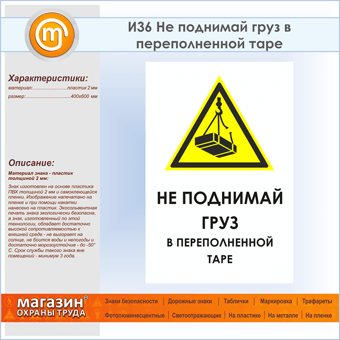 Знак «Не поднимай груз в переполненной таре», И36 (пластик, 400х600 мм) в Сургуте купить
