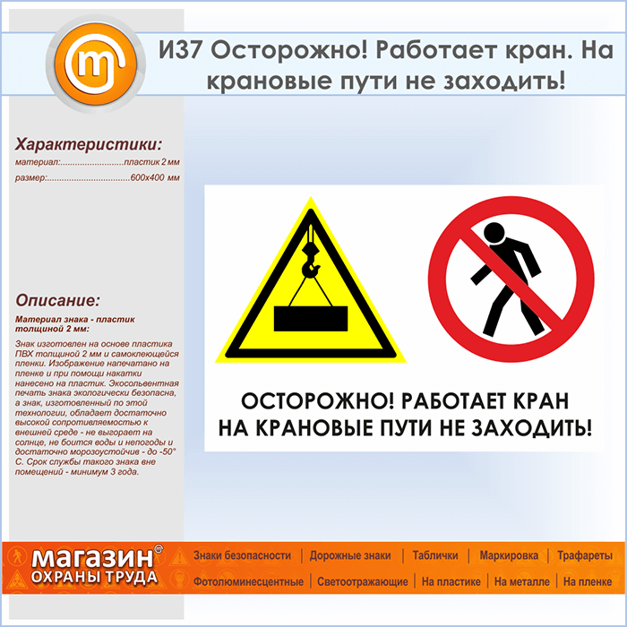 Знак «Осторожно! Работает кран. На крановые пути не заходить!», И37 (пластик, 600х400 мм) в Сургуте купить