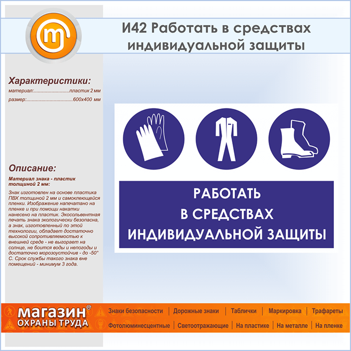 Знак «Работать в средствах индивидуальной защиты», И42 (пластик, 600х400 мм) в Сургуте купить