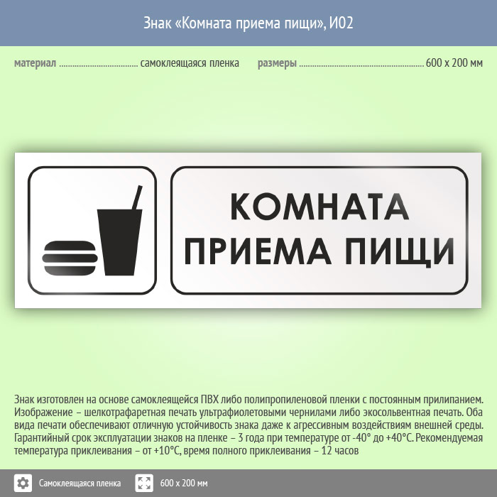 Знак «Комната приема пищи», И02 (пленка, 600х200 мм) в Сургуте купить