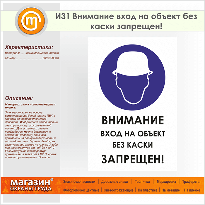 Знак «Внимание вход на объект без каски запрещен!», И31 (пленка, 600х900 мм) в Сургуте купить